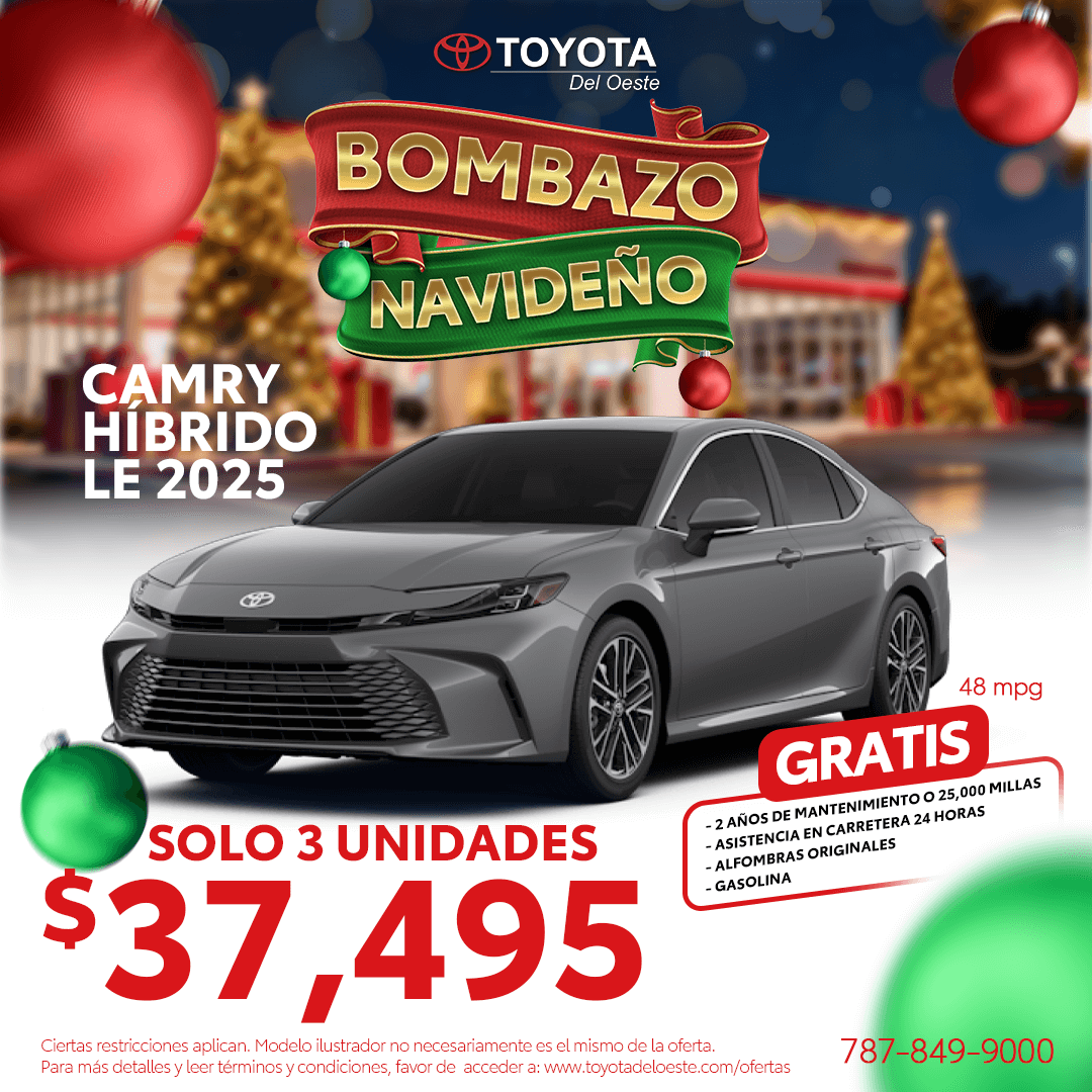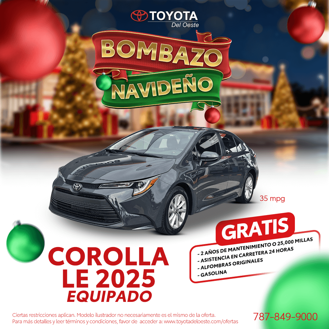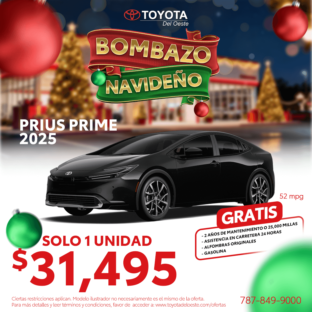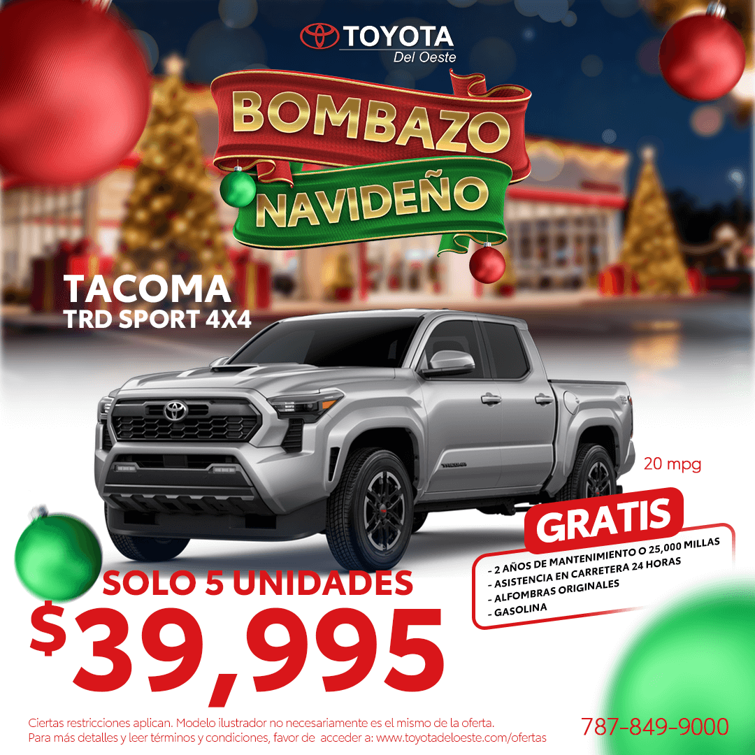 Sujeto a aprobación de crédito. Las ofertas no incluyen seguros, tablilla ni ACAA. Ofertas y descuentos gracias a nuestros auspiciadores: Toyota Del Oeste, Toyota Financial Services, Toyota De Puerto Rico y Premier Insurance Company. Requisitos para estas ofertas productos, contrato de servicio de 7 años o 100,000 millas y financiamiento con TFS. Toyota Corolla LE 2025 equipado modelo 1682 precio de ventas $28,995 descuento de $4,000 y precio final de $24,995. Toyota Tacoma TRD Sport 4x4 modelo 7328 precio de ventas $49,995 descuento de $8,000 para un precio final de $41,995. Solo 2 unidades disponibles Stock No. ST079317 y ST086398. Toyota Camry SE híbrido 2025 modelo 2612 precio de ventas $39,995 descuento de $4,500 para un precio final de $37,495. Solo 3 unidades disponibles Stock No. SU177145, SU637968 y SU650050. Toyota Prius Prime 2025 modelo 1175 precio de venta $35,995 descuento de $4,500 para un precio final de $31,495. Solo 1 unidad disponible Stock No. S3047999. Toyota Tacoma SR 2025 modelo 7300 precio de venta $34,995 descuento de $4,500 precio final de $30,495. Solo 2 unidades disponibles. Stock No. ST020775 y ST021014. Más detalle en el dealer. Ciertas restricciones se aplican. Las ofertas no se combinan con otras ofertas publicadas ni se combinan entre sí. Bonos no se cambia por dinero.