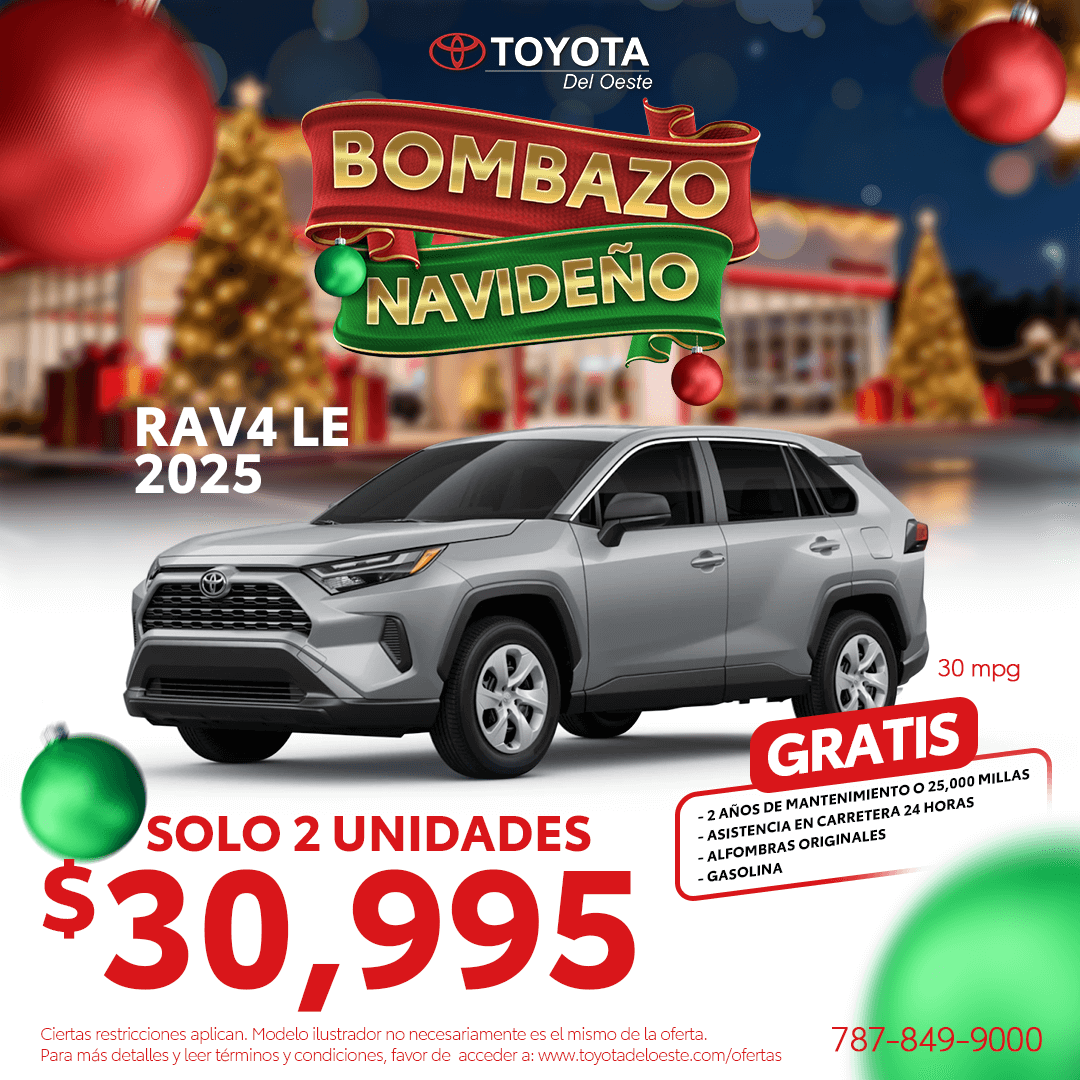 Sujeto a aprobación de crédito. Las ofertas no incluyen seguros, tablilla ni ACAA. Ofertas y descuentos gracias a nuestros auspiciadores: Toyota Del Oeste, Toyota Financial Services, Toyota De Puerto Rico y Premier Insurance Company. Requisitos para estas ofertas productos, contrato de servicio de 7 años o 100,000 millas y financiamiento con TFS. Toyota Rav4 LE 2025 modelo 4360 precio de ventas $34,995 descuento de $4,000 para un precio final de $30,995 Solo 5 unidades disponibles Stock No. SD126733, SD126977, SD127582, SD128046 y SD133321. Toyota Tacoma TRD Sport 2025 modelo 7304 precio de ventas $46,995 descuento de $7,500 para un precio final de $39,495 Solo 5 unidades disponibles Stock No. ST021865, ST021932, ST022034, ST022194 Y ST023293. Toyota Corolla LE 2025 modelo 1695 precio de ventas $26,995 descuentos de $3,500 para un precio final de $23,495 Stock No. SJ019790, SJ019760, S3029229, S3029554 y SJ020132. Oferta del Toyota Corolla LE 2025 modelo 1695 y Corolla Sport 2025 modelo 1684 cliente tendrá la opción de seleccionar un APR especial de 3.98% en préstamos convencional hasta 72 meses y/o préstamo Smart Equity Plan "balloon" a 66 meses con residual, solo para clientes con puntuación de crédito desde 750 puntos. Más detalle en el dealer. Ciertas restricciones se aplican. Las ofertas no se combinan con otras ofertas publicadas ni se combinan entre sí. Bonos no se cambia por dinero.